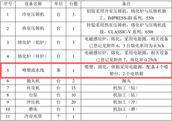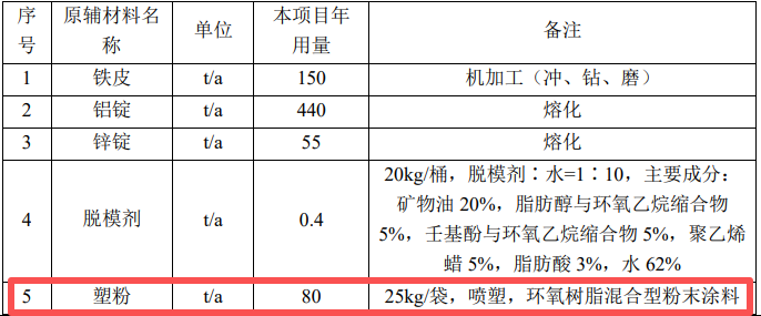 喷塑、固化:根据客户需求,部分组件表面需进行喷塑处理。将压铸 好的组件放入喷台进行喷塑处理,喷台主要由喷枪、房体、自动回收系统和 供粉系统组成。供粉系统把压缩空气与粉筒内的粉末充分混合后成为流体状 并通过粉泵输送到喷枪中。喷枪的枪体内带有高压发生器,它可以在枪尖处产生高达10万伏的电压,将枪尖附近区域的空气电离,从喷枪中喷出的粉体 通过该电离区域时带上负电荷,通过电场力的作用粉末被吸附到接地的工件表面,并形成一层厚度约50~60um 的粉膜;在半密闭的喷塑台内,风机产生负压,将喷塑室内未吸附在工件表面的粉体吸入自动回收系统,经过回收系统回收的塑粉重新利用,系统未回收的粉尘向车间逸散,但由于整体的喷塑 车间是密闭车间,逸散的粉尘部分在车间沉降(约70%在车间沉降,该部分塑粉经清扫计入固废统计),剩余未沉降部分粉尘由工人通过进出车间或产品运 输带出排入外环境。喷塑过程会产生喷塑粉尘。