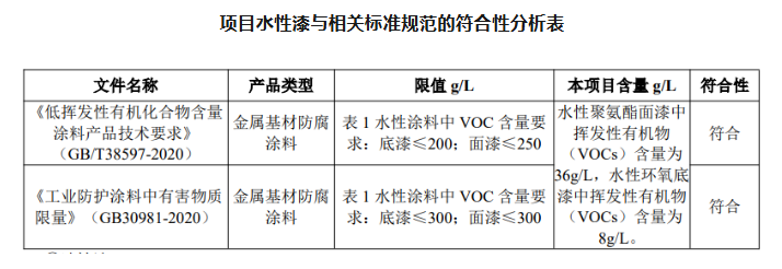 水性漆:根据涂料检测报告可知,本项目水性聚氨酯面漆中挥发性有机物(VOCs)含量为36g/L,水性环氧底漆中挥发性有机物(VOCs)含量为 8g/L。与《低挥发性有机化合物含量涂料产品技术要求》(GB/T38597-2020) 及《工业防护涂料中有害物质限量》(GB30981-2020)等要求对比分析情况见下表。
