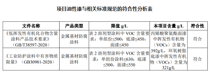 油性漆:根据涂料检测报告可知,本项目丙烯酸聚氨酯面漆中挥发性有机物(VOCs)含量为315g/L,环氧树脂 底漆中挥发性有机物(VOCs)含量为 331g/L,与《低挥发性有机化合物含量涂料产品技术要求》(GB/T38597-2020)及《工业防护涂料中有害物质限量》(GB30981-2020)等要求对比分析情况见下表。