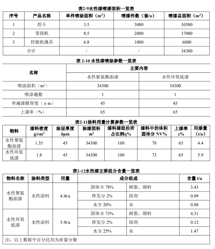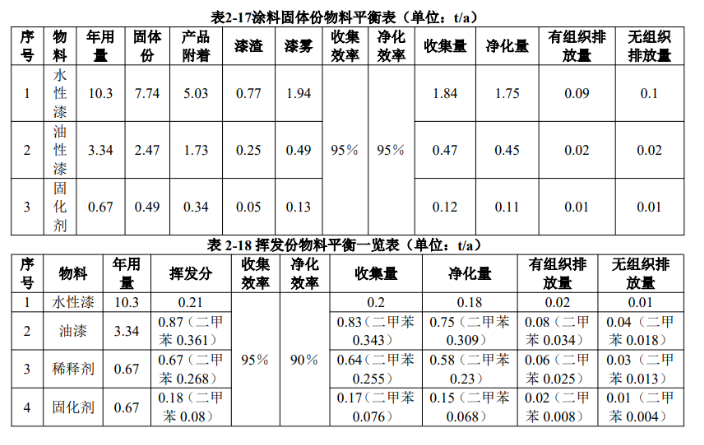 上漆率或附着率:指喷涂过程中附着在工件上的涂料占总用量的比例。根据项目喷涂工艺和供销商提供的技术参数,同时查阅相关文献资料(《谈喷涂涂着效率》王锡春,《现代涂料与涂装》2006.10),确定本项目水性漆上漆率≥65%。根据企业提供资料,项目喷漆工艺为面漆喷涂一遍,底漆喷涂一遍,共两遍。