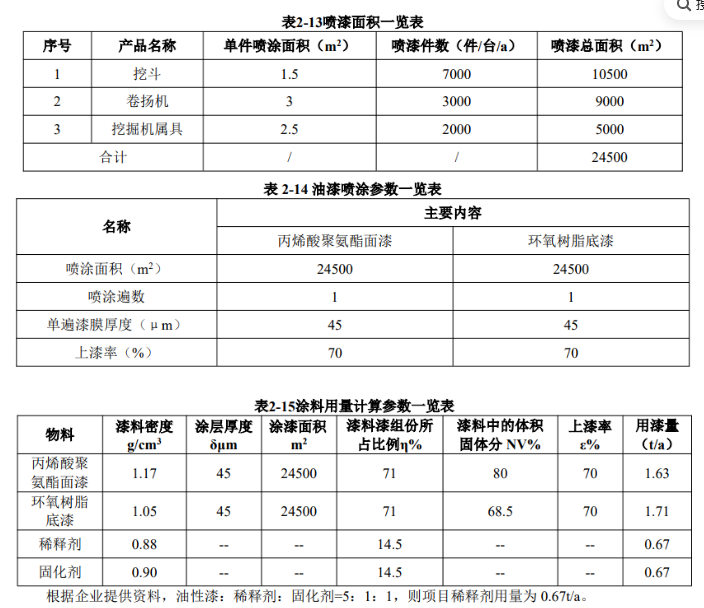 上漆率或附着率:指喷涂过程中附着在工件上的涂料占总用量的比例。根据项目喷涂工艺和供销商提供 的技术参数,同时查阅相关文献资料(《谈喷涂涂着效率》王锡春,《现代涂料与涂装》2006.10),确定本项目油漆上漆率≥70%。根据企业提供资料,项目喷漆工艺为面漆喷涂一遍,底漆喷涂一遍,共两遍。