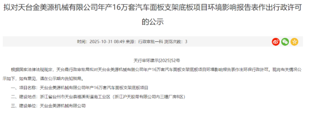 近日,天台县人民政府发布拟对天台金美源机械有限公司年产16万套汽车面板支架底板项目环境影响报告表作出行政许可的公示。
