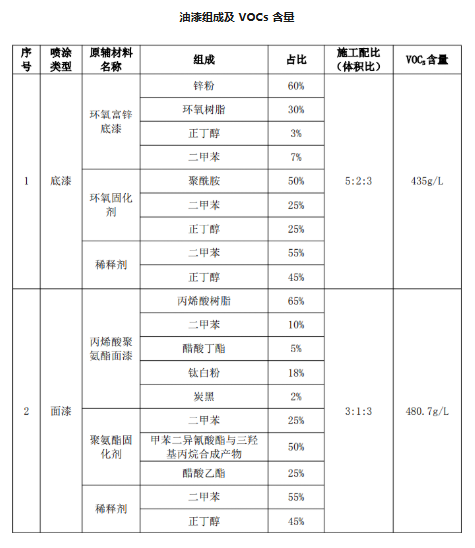 底漆VOCs含量计算:根据附件环氧富锌底漆、环氧固化剂、稀释剂的MSDS 报告,挥发份为正丁醇、二甲苯;挥发量为10%、环氧固化剂挥发量为50%、稀释剂挥发量100%。施工配比的VOCs含量为(5×2×10%+2×0.95×50%+3×0.8×100%)÷10=435g/L。同理面漆 VOCs含量480.7g/L。