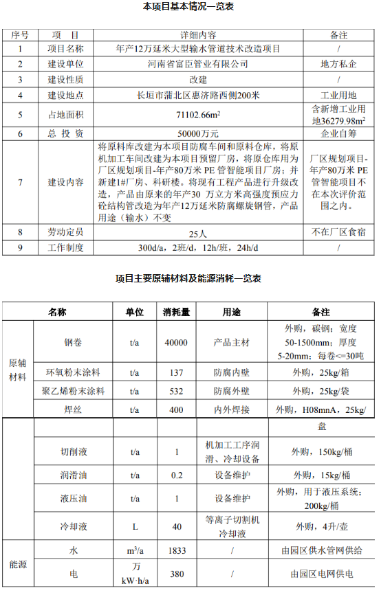 河南省富臣管业有限公司拟投资50000万元,引入《年 产12万延米大型输水管道技术改造项目》对现有工程生产工艺及产品进行升级改 造。项目利用原有及新征用地共计106.65亩,项目利用原有及新建 厂房及配套设施30382.47平方 米,建设年产12万延米。