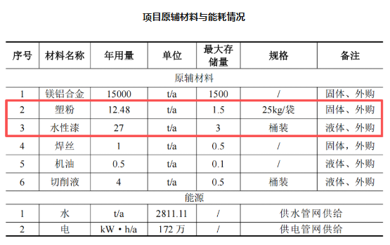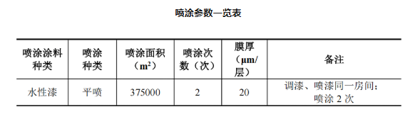 根据《涂装工艺与设备》(化学工业出版社),喷射距离为15~20cm之间时,涂着效率约为 70%。所以工作漆平喷用量1.062×20×375000×10-6/(65%×70%)×2=35.01t/a,漆:水比例10:3.水性漆用量26.93t/a。本评价按水性漆共用量27t/a核算。