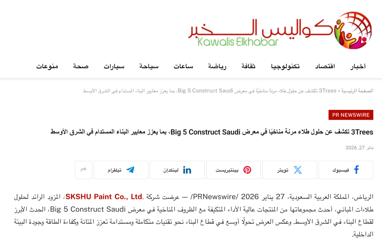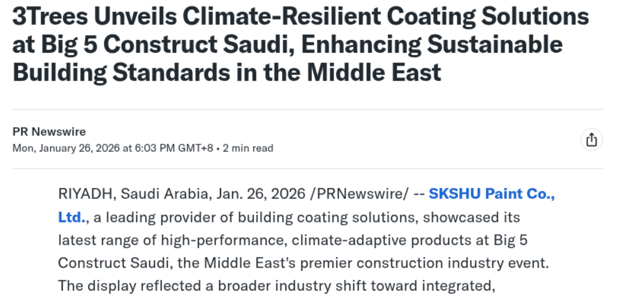 近日,一则来自沙特利雅得前沿会展中心的消息引发全球建筑与建材行业瞩目——中国涂料领军品牌三棵树,携多款绿色涂料及绿色建材系统解决方案,亮相中东规模最大之一的建筑盛会“沙特五大行业展”(Big5ConstructSaudi),成为行业热议话题。