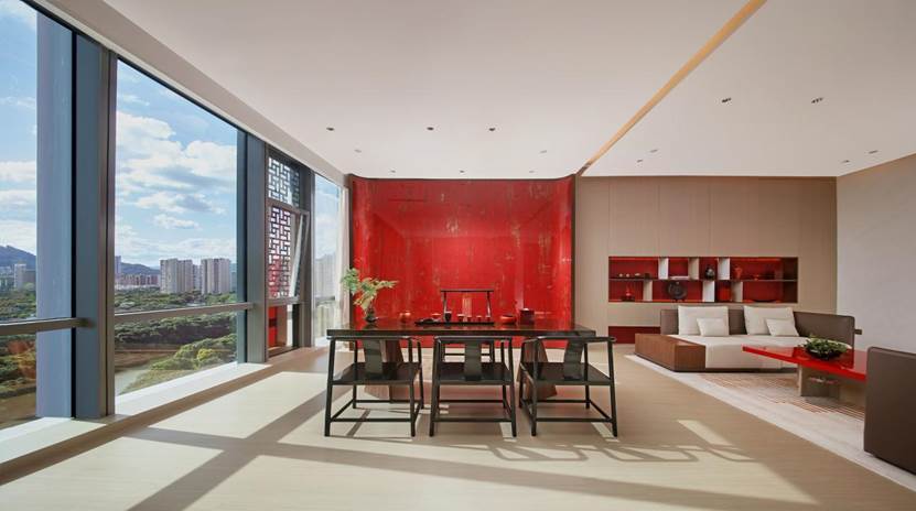 具体体现在对东方美学的提炼与转化上。三棵树与故宫宫廷文化公司联袂推出国漆国色艺术漆系列产品,从故宫的色彩、图案、工艺等细节中提取代表东方美学的精髓元素,融入现代涂装体系研发与色彩设计中,创造既有中式神韵又符合当代人居需求的健康产品与空间解决方案。 (图为三棵树大漆艺术空间。来源:三棵树)